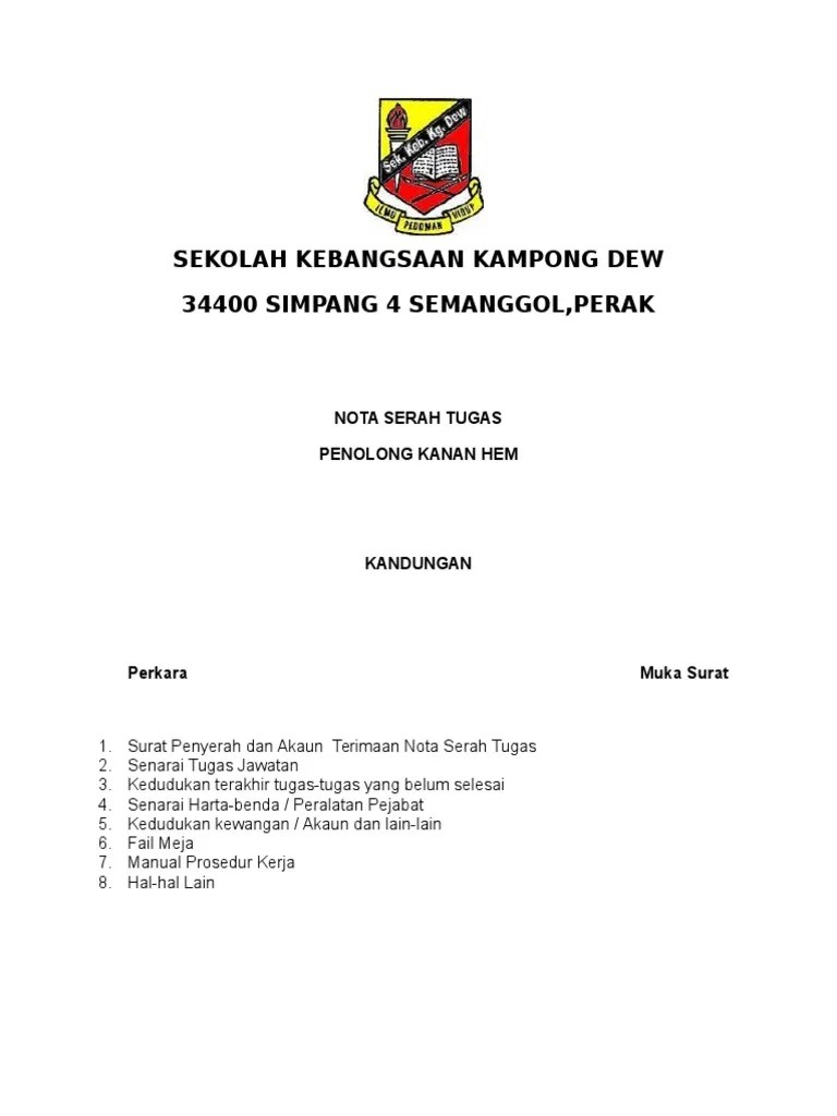 Contoh nota serah tugas kakitangan awam guru. Check spelling or type a new query. Nota serah tugas kernai kewangan. We did not find results for: Surat rasmi serah tugas surasmi x. Surat nota serah tugas from img.pdfslide.tips. You have just read the article entitled arahan nota serah tugas oleh jabatan perkhidmatan awam. Nota serah tugas telah diserahkan oleh ybhg. Penyediaan nota serah tugas jawatan pdf document. Hal ini termasuklah pertukaran, persaraan atau penamatan perkhidmatan. Nota serah tugas kernai kewangan. Check spelling or type a new. Senarai hartabenda / peralatan pejabat 5.
